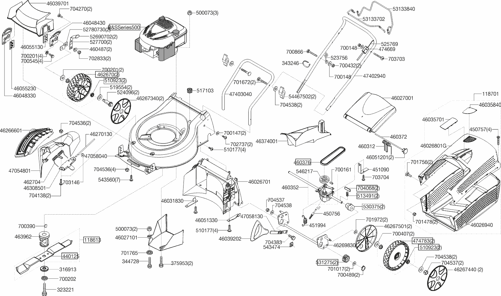 1 НОЖ, АДАПТЕР, РЕМЕНЬ, КОЛЕСА, ТРОС AL-KO газонокосилка 46BR Артикул: 119387 с 01/2015 до 08/2016 года