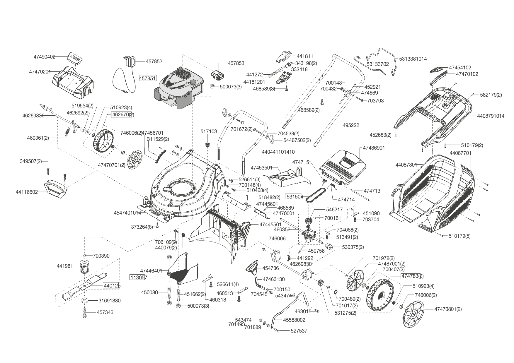 1 НОЖ, АДАПТЕР, РЕМЕНЬ, КОЛЕСА, ТРОС AL-KO бензиновая газонокосилка Comfort 46.0 SPI-A Артикул: 119940