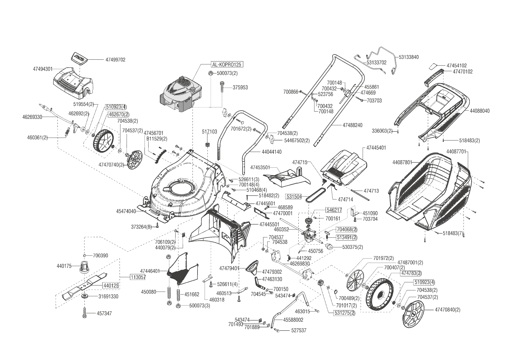 1| AL-KO газонокосилка бензиновая Highline 46.5 SP-A Артикул: 119617 | с 03/2018 года |НОЖ, АДАПТЕР, РЕМЕНЬ, КОЛЕСА, ТРОС | Запчасти | Ремонт AL-KO