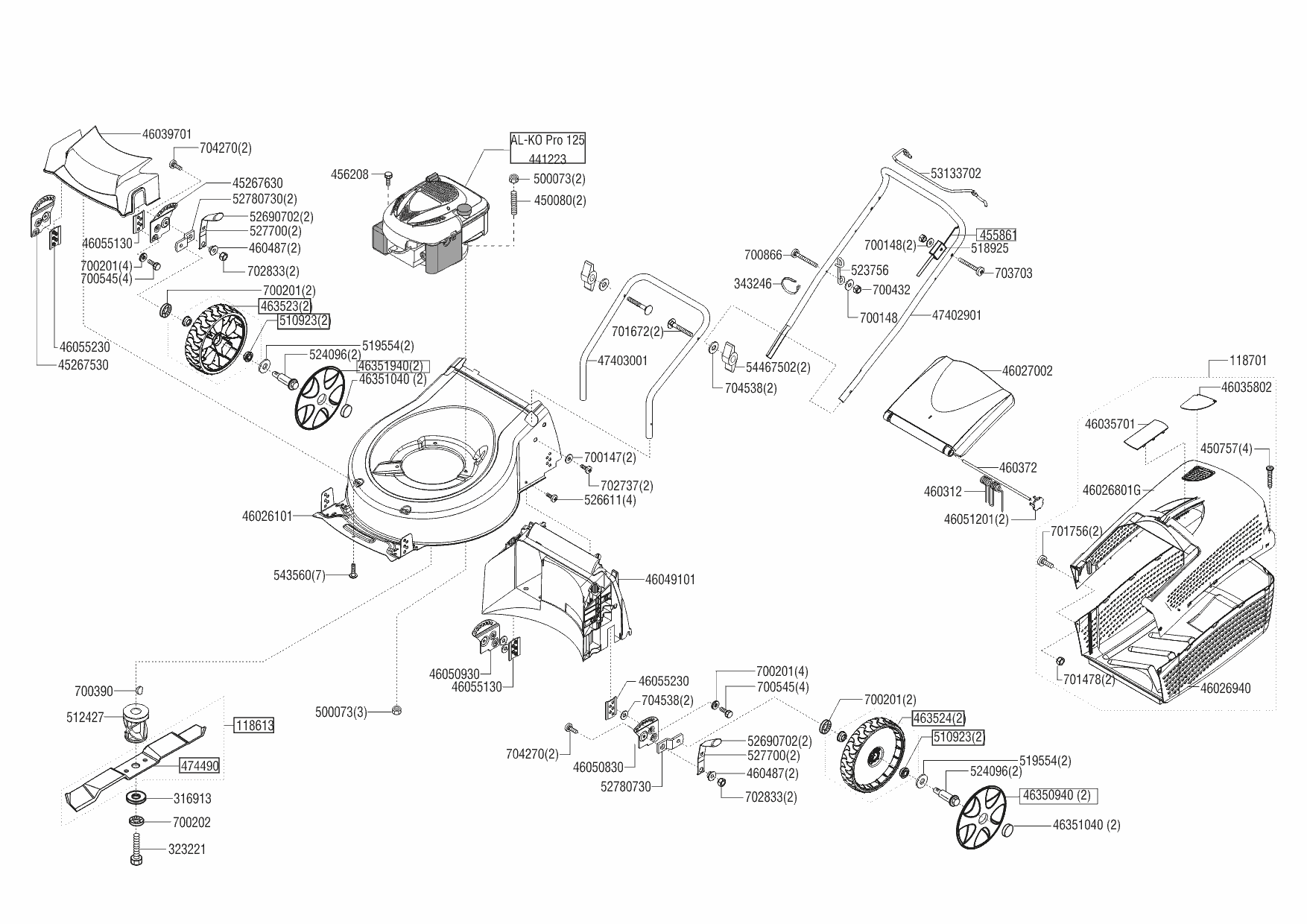 1 НОЖ, АДАПТЕР, РЕМЕНЬ, КОЛЕСА, РУЧКА, ТРОС AL-KO газонокосилка Classic 4.66 P-A edition Артикул: 119765 с 03/2016 до 08/2016 года