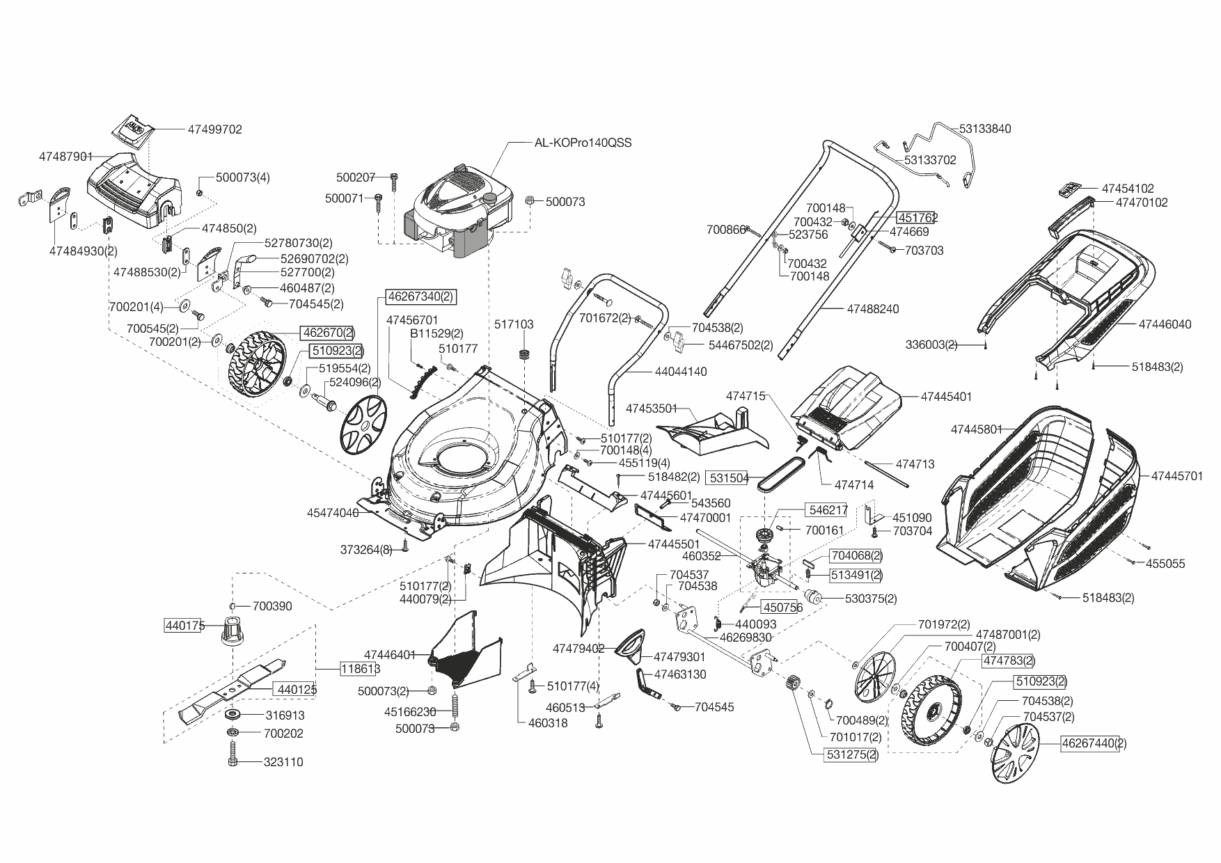 1| НОЖ, АДАПТЕР, РЕМЕНЬ, КОЛЕСА, ТРОС | AL-KO газонокосилка Highline 46.3 SP-A | Артикул: 119475 с 02/2013 до 11/2013 года