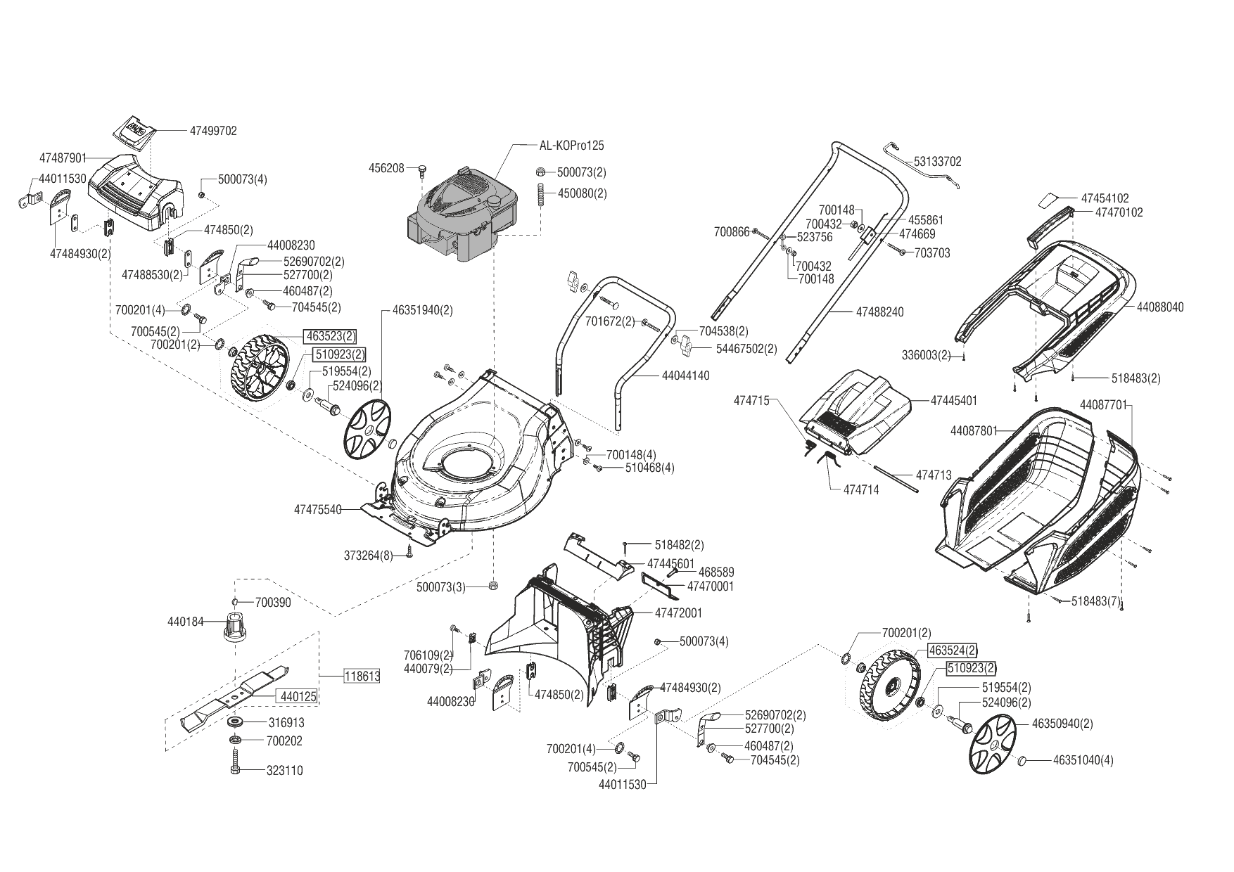 1 НОЖ, АДАПТЕР, РЕМЕНЬ, КОЛЕСА, ТРОС AL-KO газонокосилка Highline 46.5 P-A Артикул: 119616 с 03/2016 до 08/2016 года