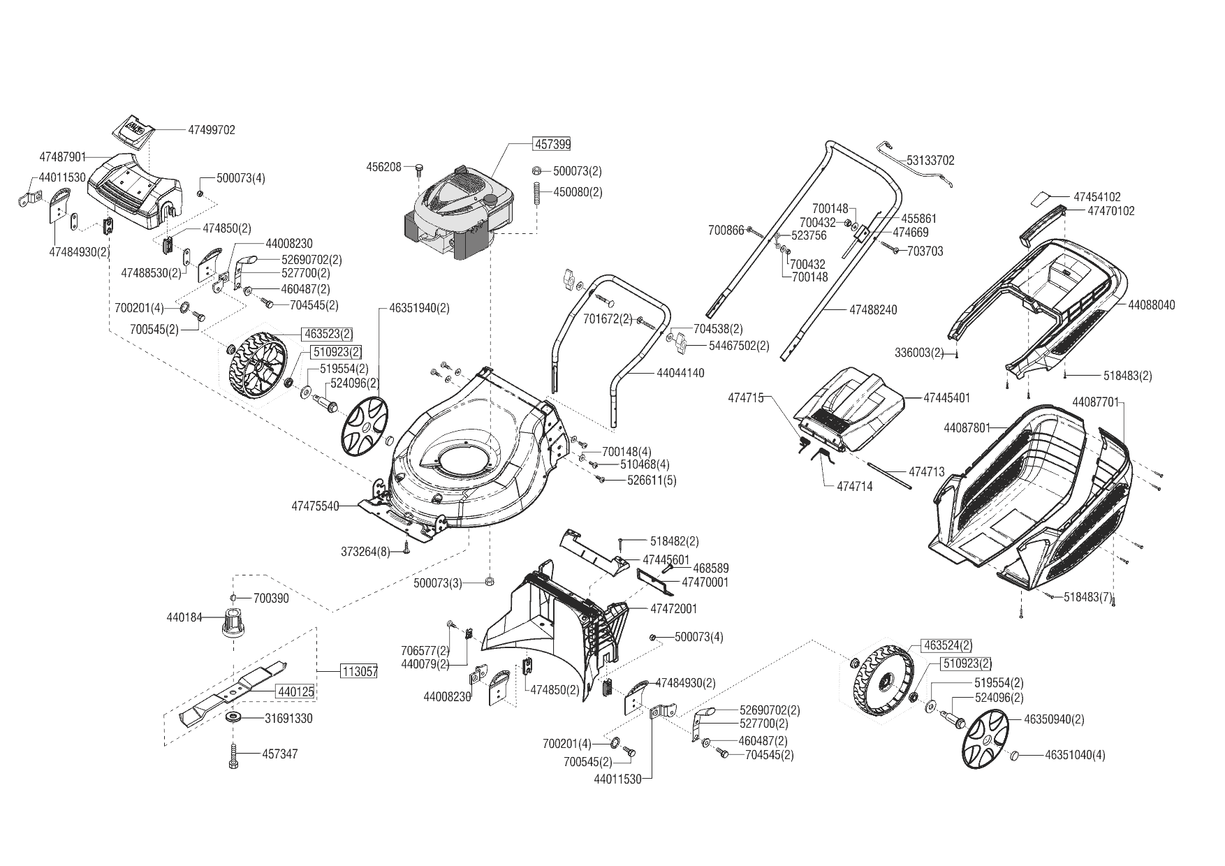 1 НОЖ, АДАПТЕР, РЕМЕНЬ, КОЛЕСА, ТРОС AL-KO газонокосилка Highline 46.8 P-A Артикул: 119841 с 03/2018 до 03/2019 года