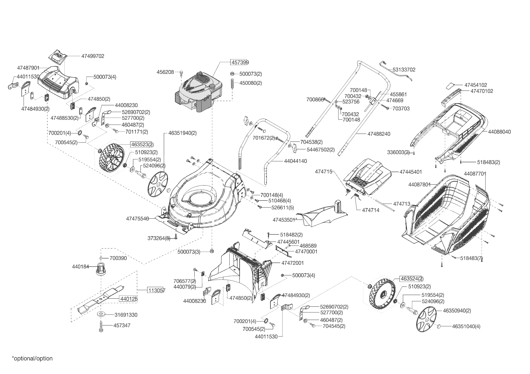 1 НОЖ, АДАПТЕР, РЕМЕНЬ, КОЛЕСА, ТРОС AL-KO газонокосилка Highline 46.8 P-A Артикул: 119841 с 07/2019 года