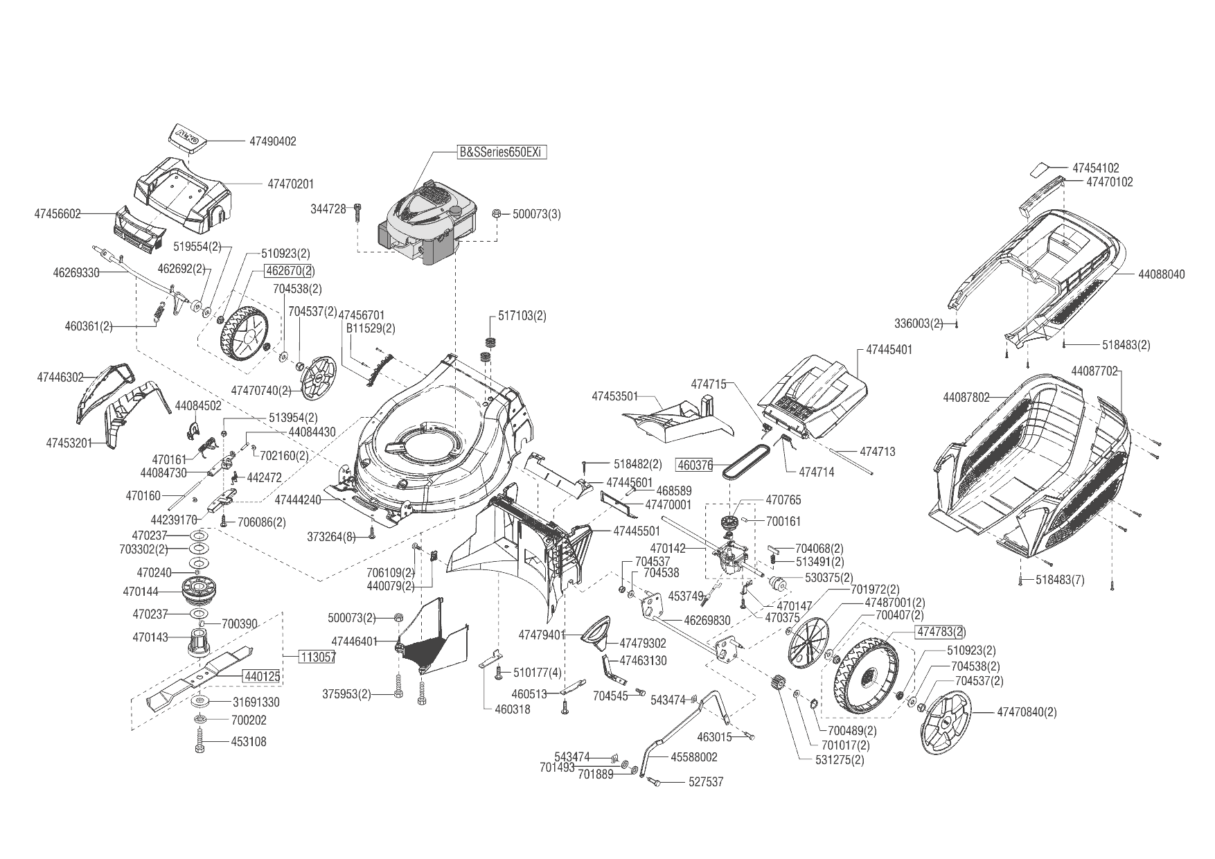 1 НОЖ, АДАПТЕР, РЕМЕНЬ, КОЛЕСА, ТРОС AL-KO газонокосилка бензиновая Highline 477 VS Артикул: 119768 с 03/2019 года