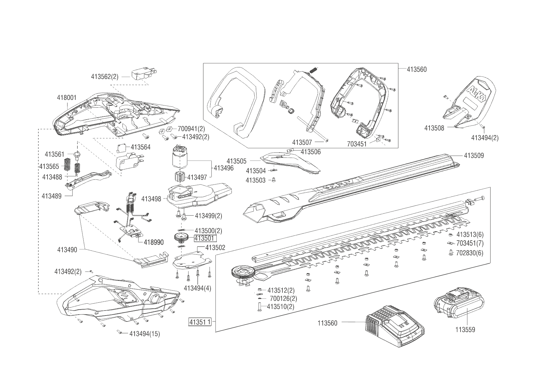 1 ЭЛЕКТРОДВИГАТЕЛЬ, АККУМУЛЯТОР, ЗАРЯДКА AL-KO кусторез аккумуляторный HT 2050 Артикул: 113634 Запчасти