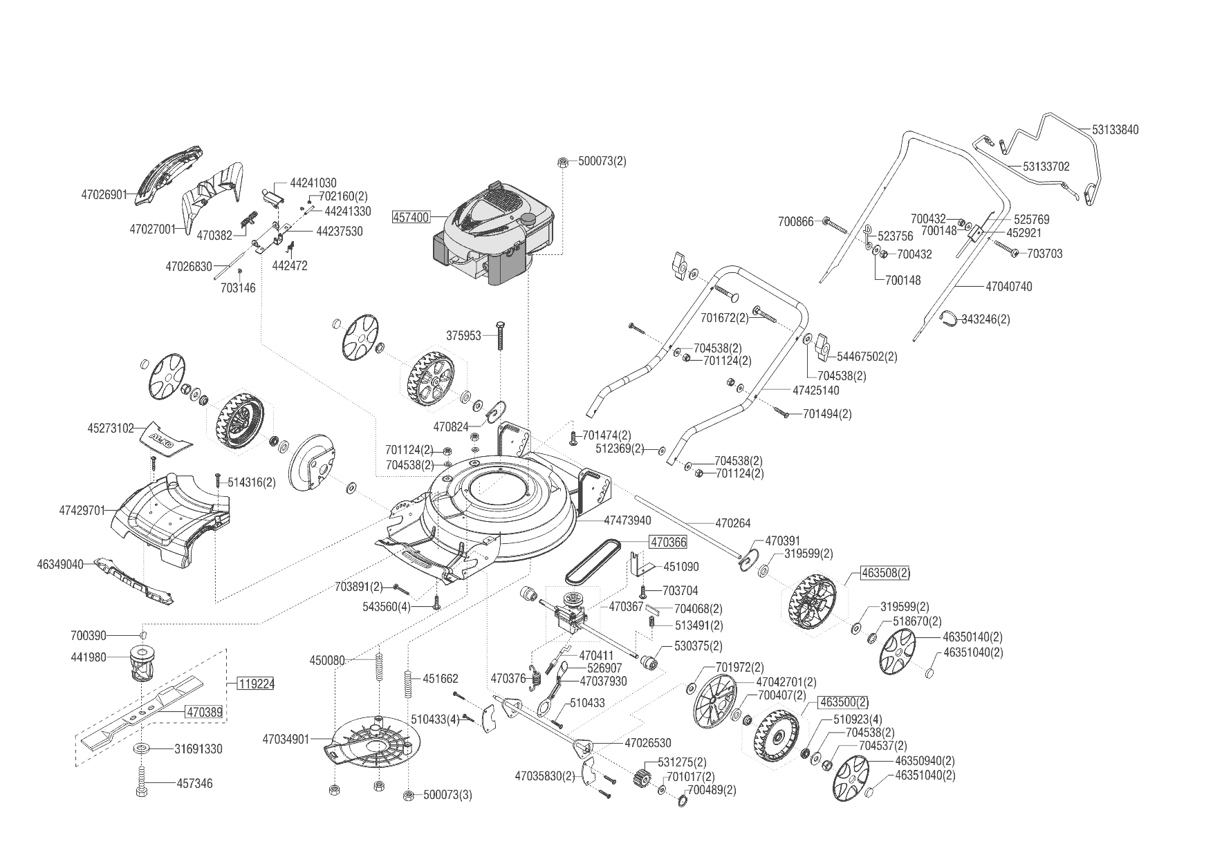 1 НОЖ, АДАПТЕР, РЕМЕНЬ, КОЛЕСА, ТРОС AL-KO газонокосилка Silver 468 SP-A Bio Артикул: 119835 с 02/2019 до 09/2019 года