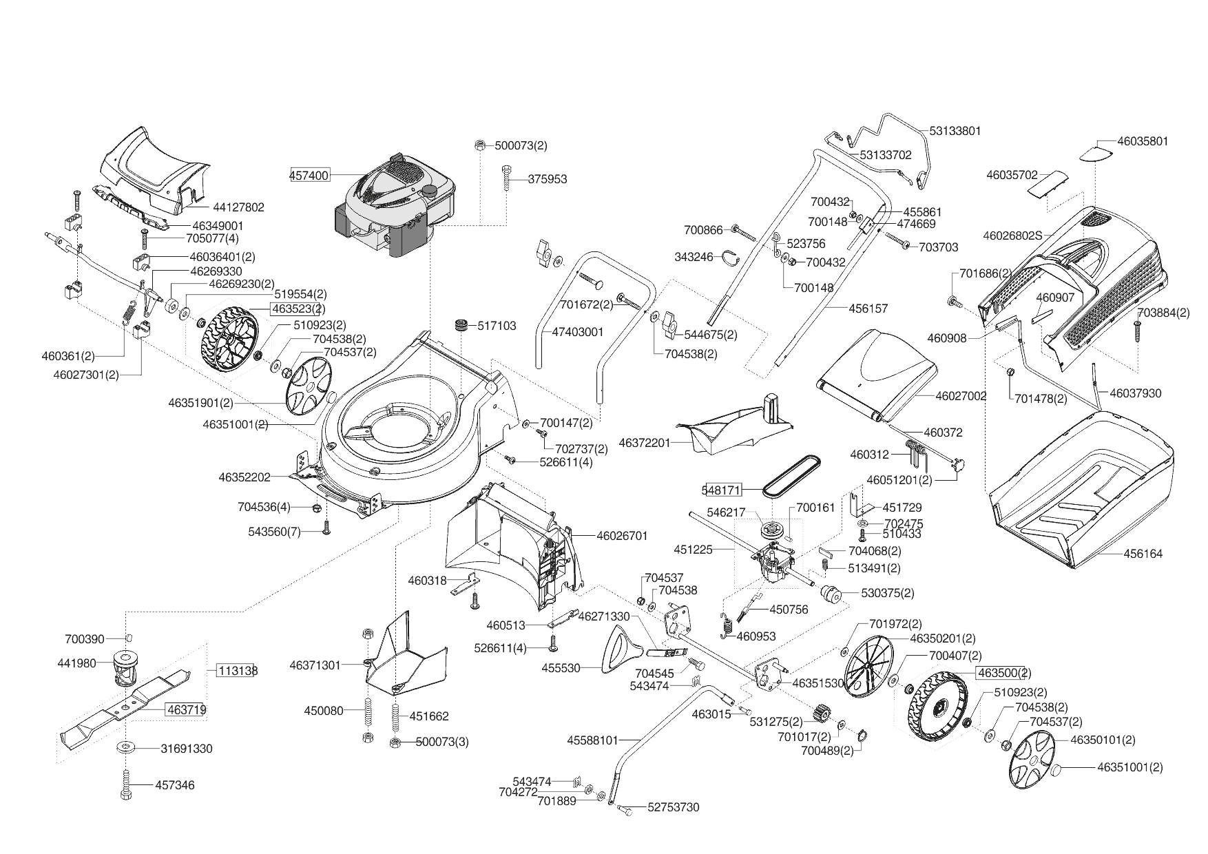 1 РУЧКА, ТРОС, НОЖ, АДАПТЕР, РЕМЕНЬ, КОЛЕСА solo by AL-KO газонокосилка 4238 SP-A Артикул 127454 c 03/2019 года